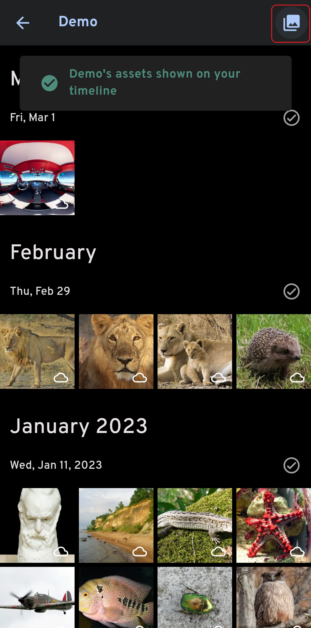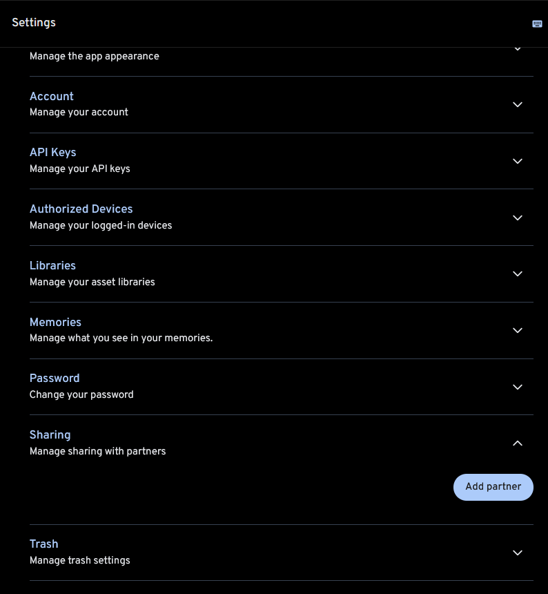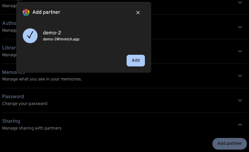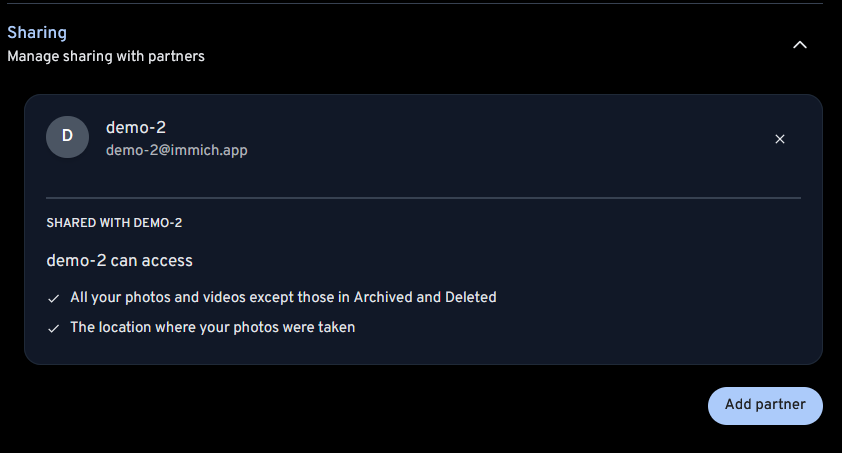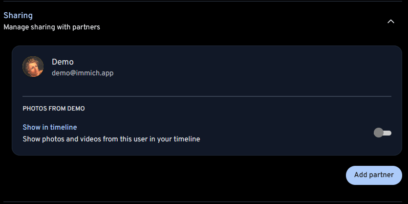 Partner shared photos can be displayed in the main timeline. This feature can be enabled on a per-partner basis and can be viewed and updated on both the web and mobile app.