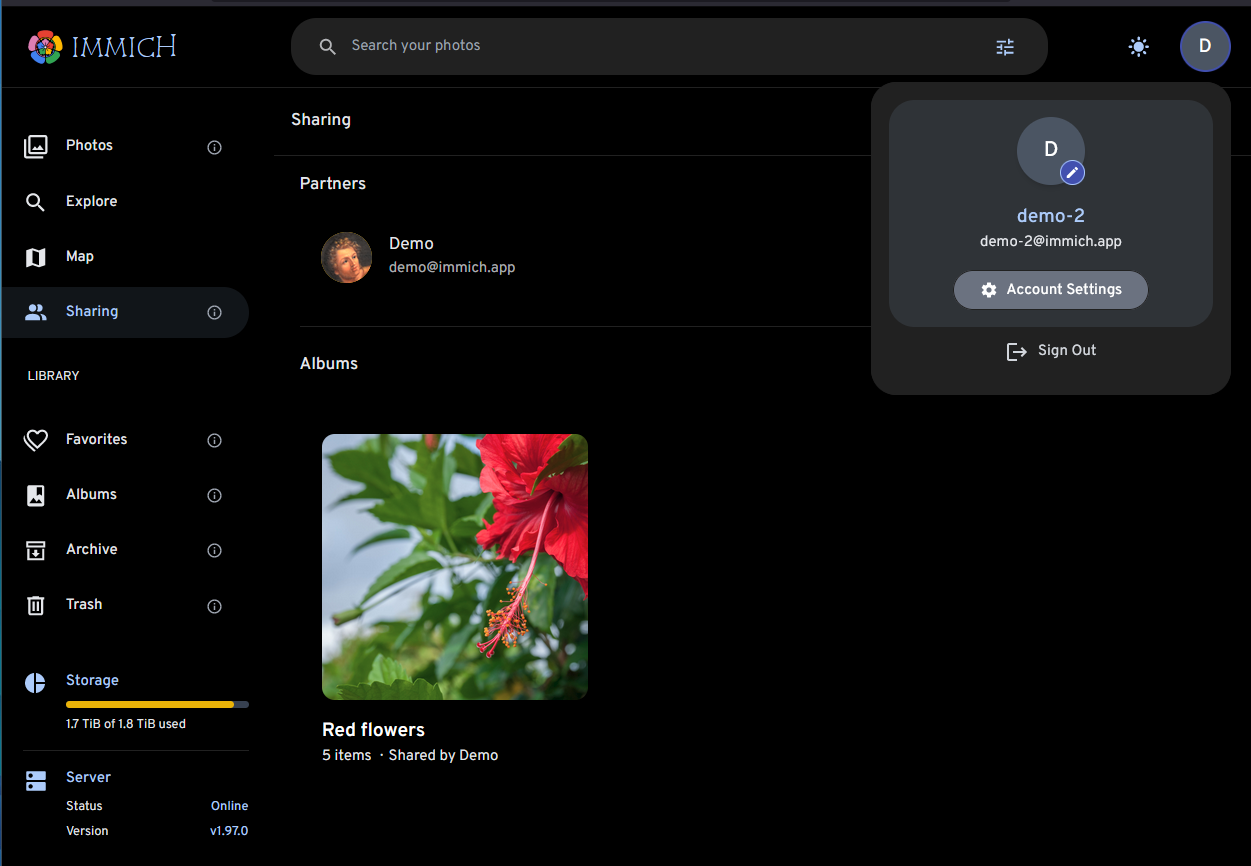 Immich allows you to share your library with other users. They can then view your library and download the assets. You can manage Partner Sharing from the User Settings page on the web.