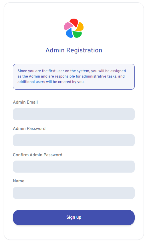 The first user to register will be the admin user. The admin user will be able to add other users to the application.